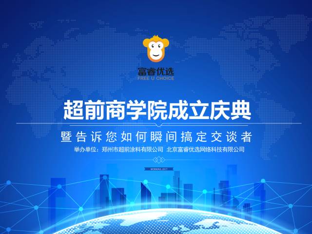 2017年04月19日,超前商學(xué)院成立揭牌啟動大會在鄭州隆重召開,鄭州市超前涂料董事長、北京富睿優(yōu)選選董事長—閻運(yùn)鋒,人社部高級人力資源管理師、WFA國際促動師協(xié)會行動學(xué)促動師—代志杰,中國智慧策略應(yīng)用專家、企業(yè)運(yùn)營管理專家、飛漲策略(北京)品牌管理有限公司董事長—董建明等50多位企業(yè)家與公司員工出席本次活動。